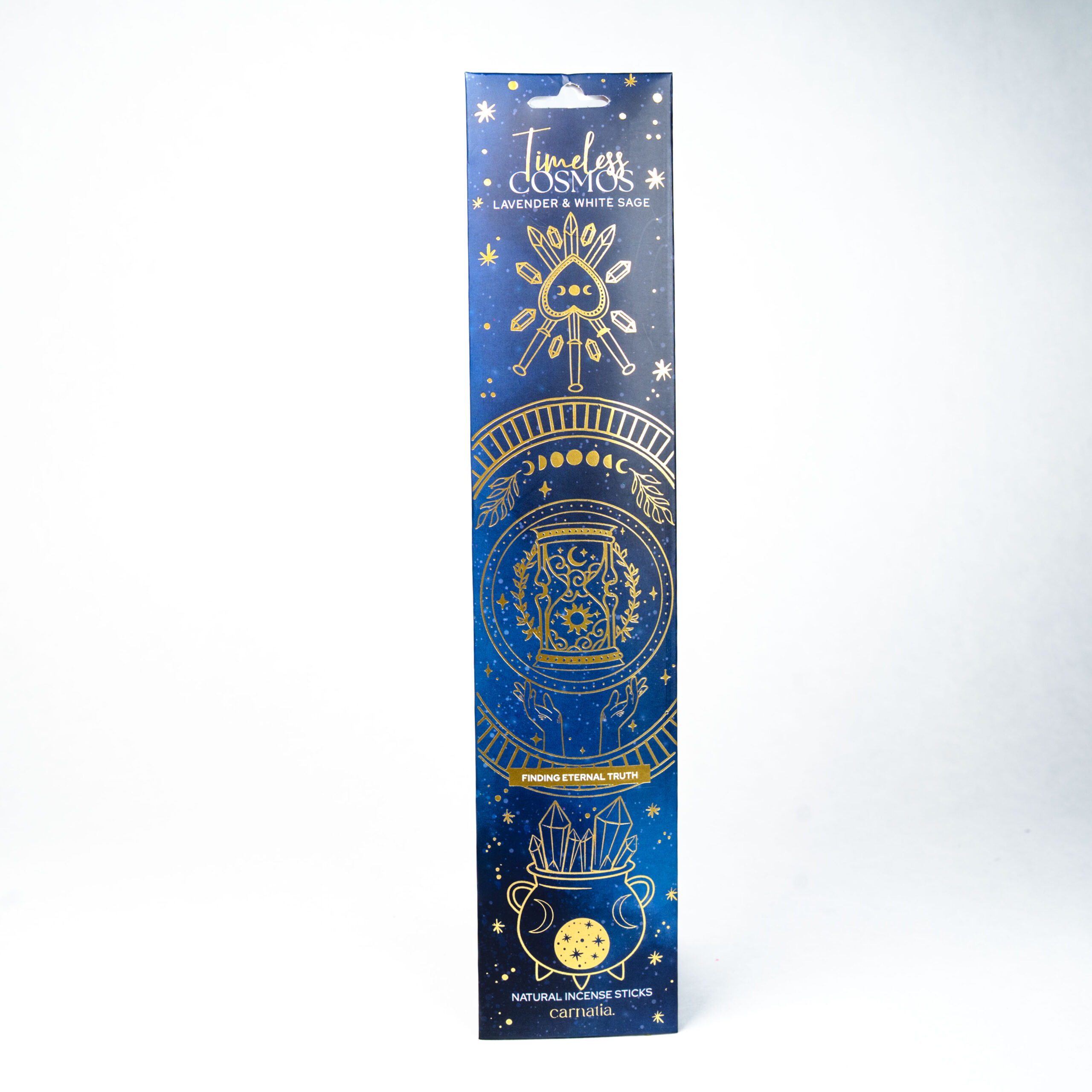 Vonné tyčinky Carnatia Starry Spell Timeless Cosmos propojují uklidňující levanduli s jemně suchým, bylinným tónem bílé šalvěje. Vůně je čistá, klidná a lehce spirituální, aniž by byla kouřově těžká.