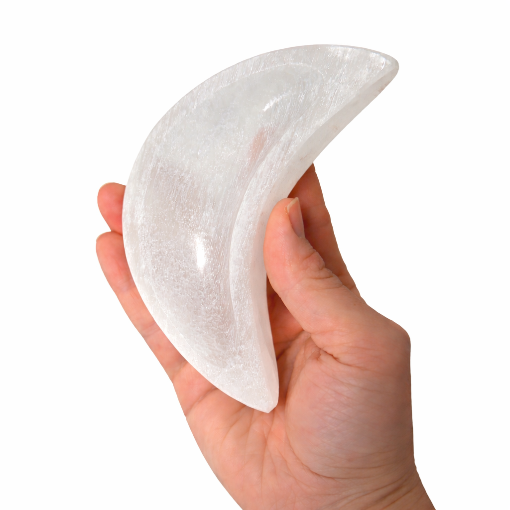 Každá selenitová miska je originál – s přirozenou kresbou, strukturou a stopami světla, které selenit nese. Jemné linie a průsvitnost jsou přirozenou součástí tohoto kamene a připomínají jeho spojení s klidem a vyššími rovinami vnímání.